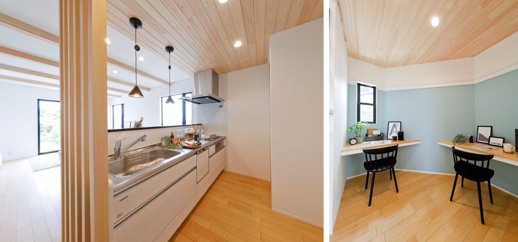 立地を活かしたウッドデッキとつながる明るい1階リビングには3面ある窓から外の景色を楽しめるキッチンスペースや、2人で使えるワークコーナーもあります