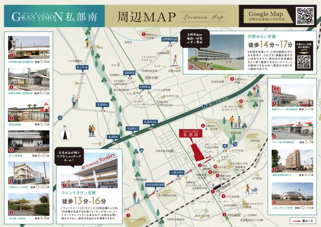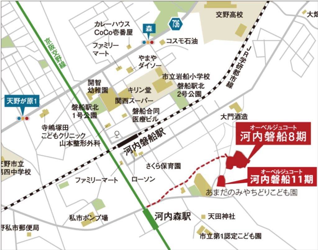 JR河内磐船駅まで徒歩5分、京阪河内森駅まで徒歩8分の好立地にある分譲地、