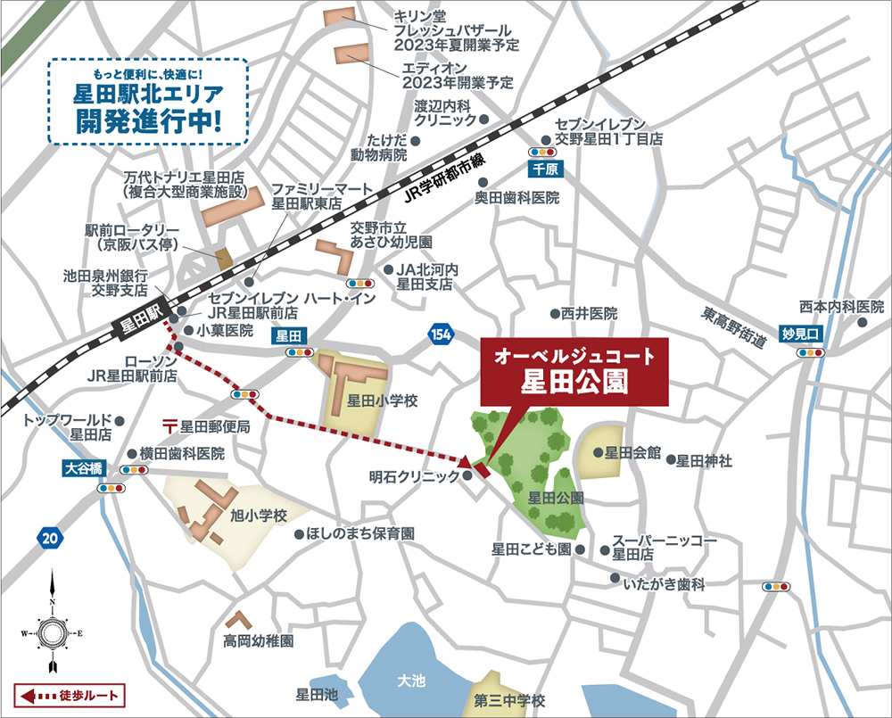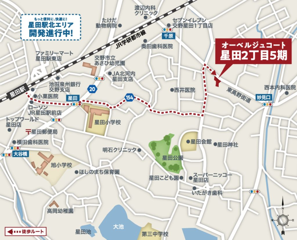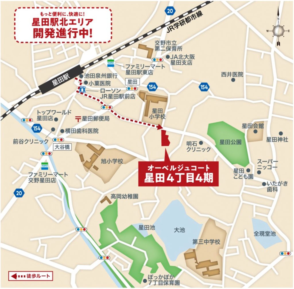 JR学研都市線「星田」駅から徒歩約7分、目の前には星田公園の自然が広がる好立地。