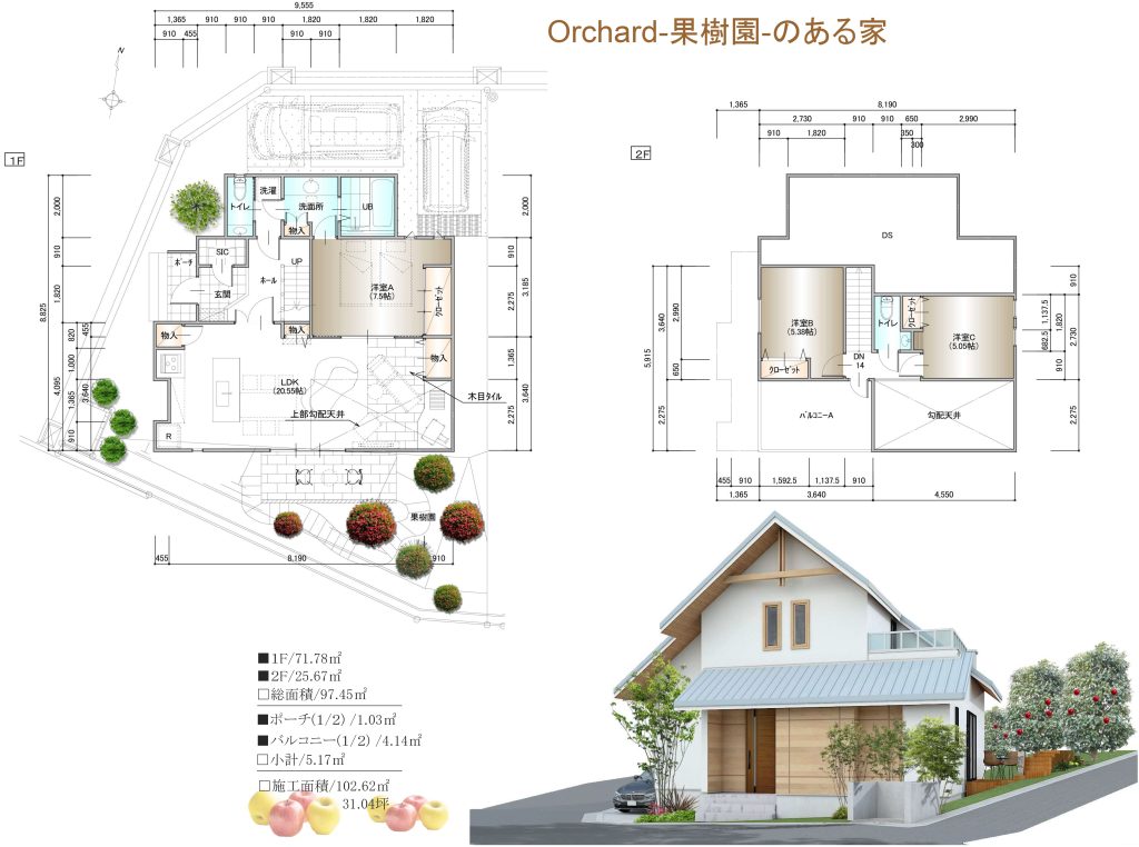 リビングに暖炉スペースもあるし、果樹園のあるお庭もカワイイ外観もめっちゃいいやん!