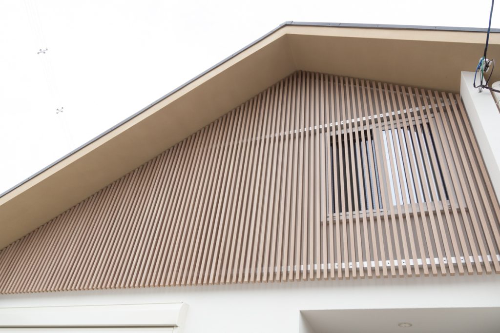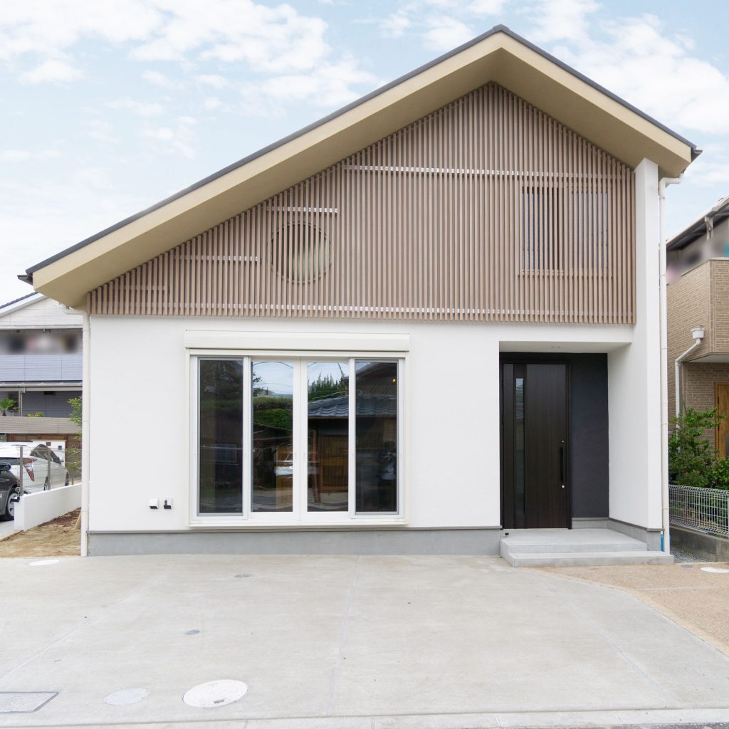 白い外壁に木の格子柵が特徴的なモデルハウス。