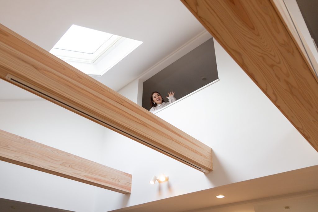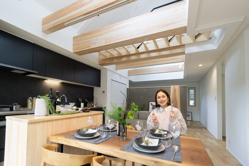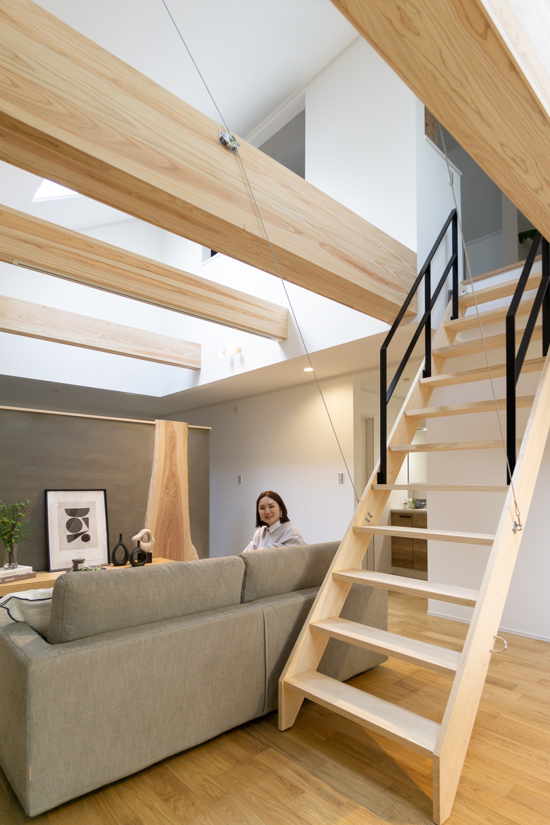 木の梁も存在感バツグンやし、天井が吹き抜けやからより部屋全体が広く感じるわぁ。