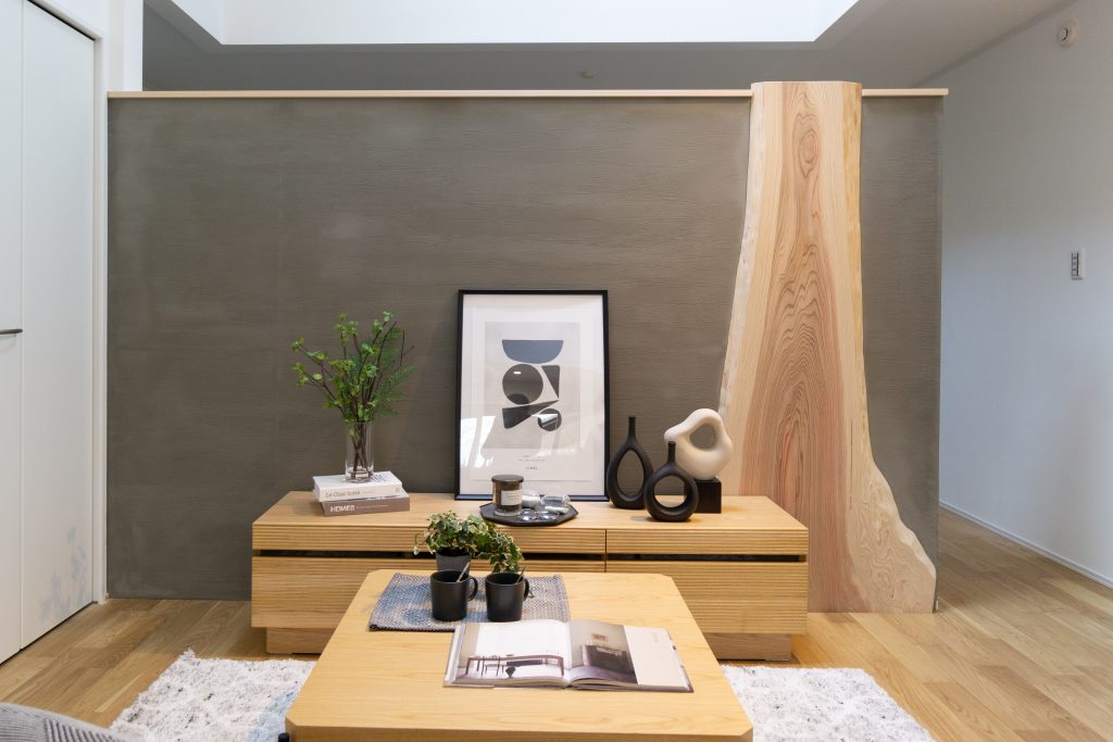 リビングの壁には、落ち着いた色合いのグレーカラーのしっくい壁。そしてアクセントとしては贅沢すぎる無垢一枚板の天然木!