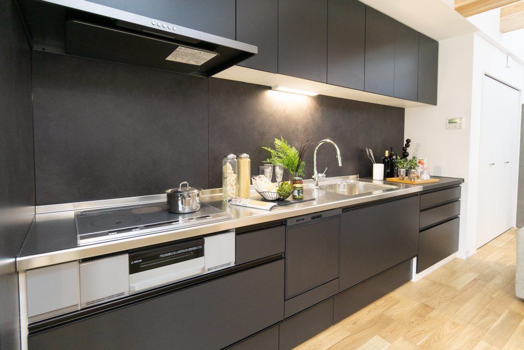 キッチンはオープンタイプで、モダンなチャコールで統一。