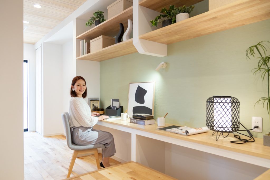 さらに階段下のスペースを活用したおこもり感のあるワークスペース、リビングの南側にはウッドデッキも備えられています。
