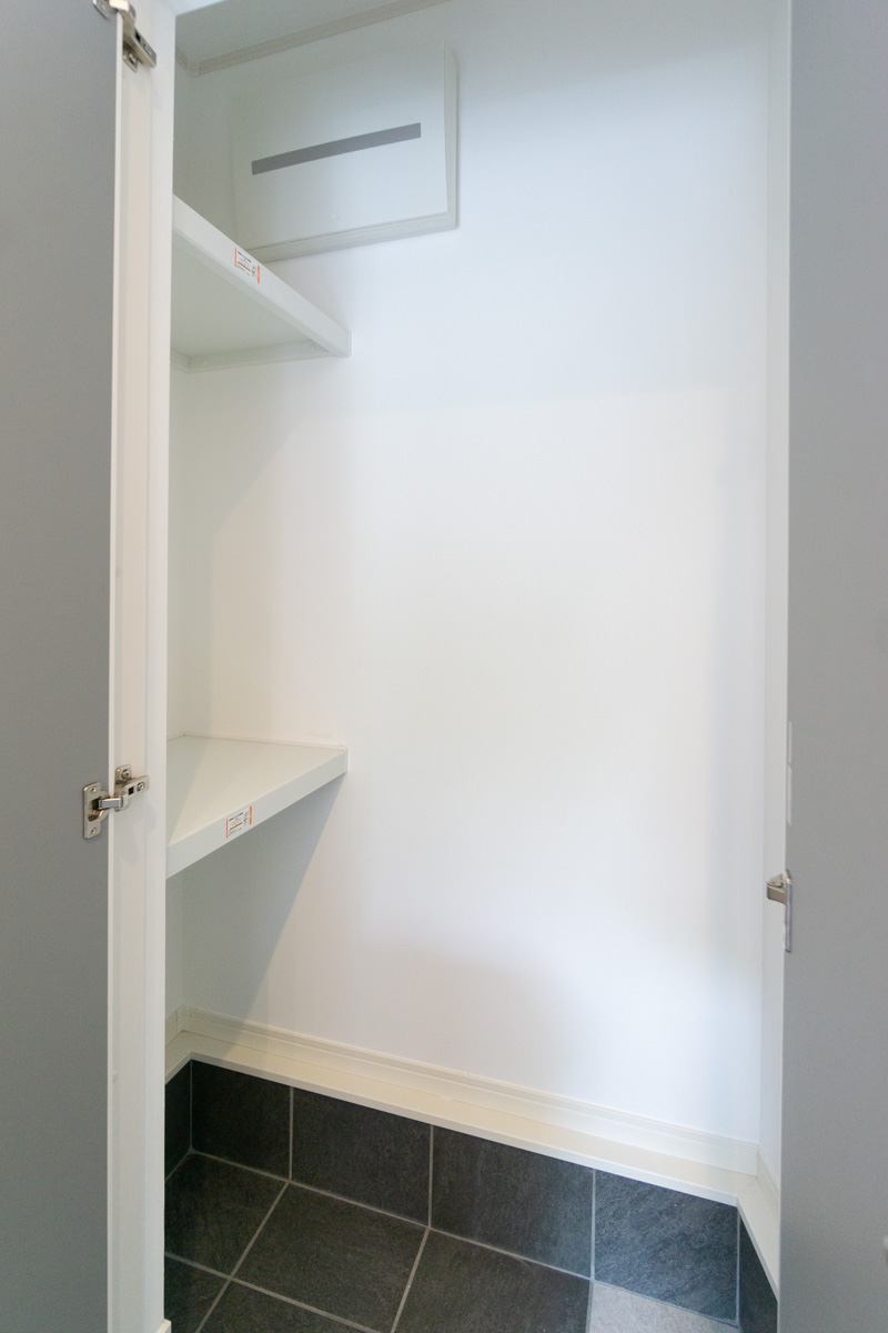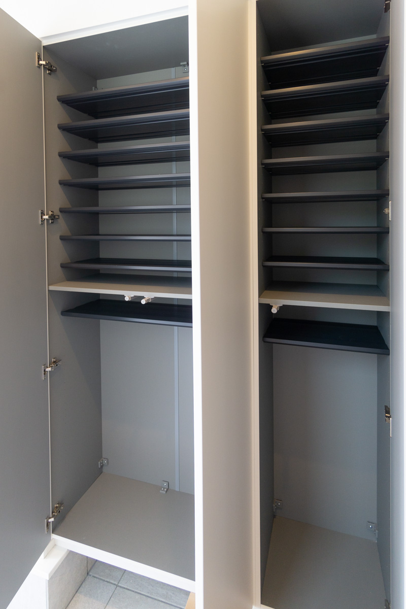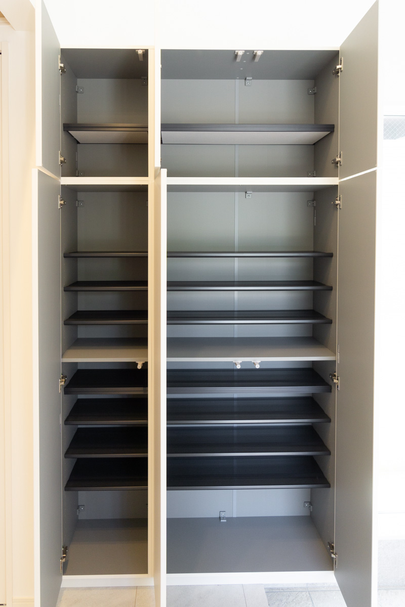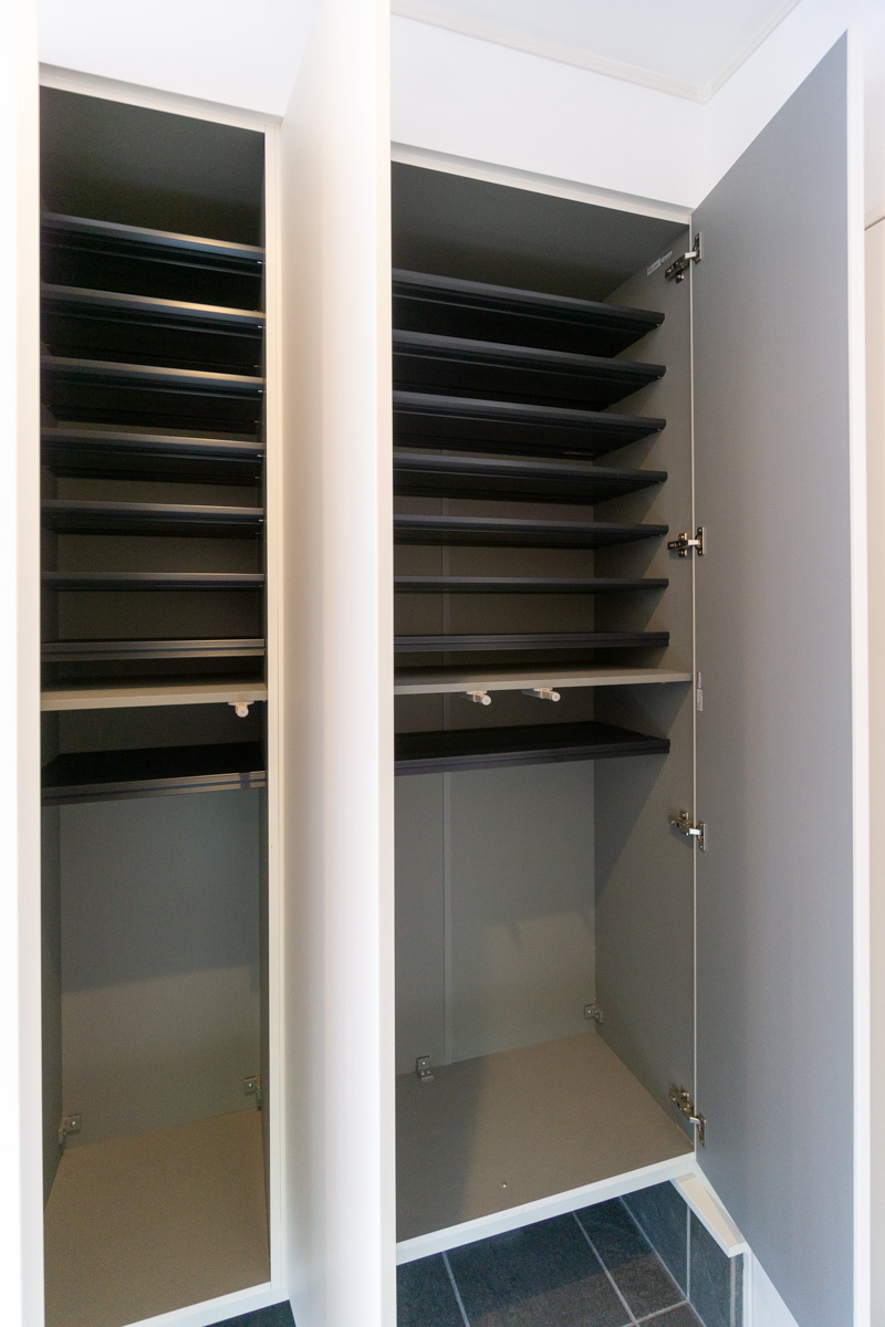 大容量のシューズクロークに、突き当りには土間収納も備えられています。