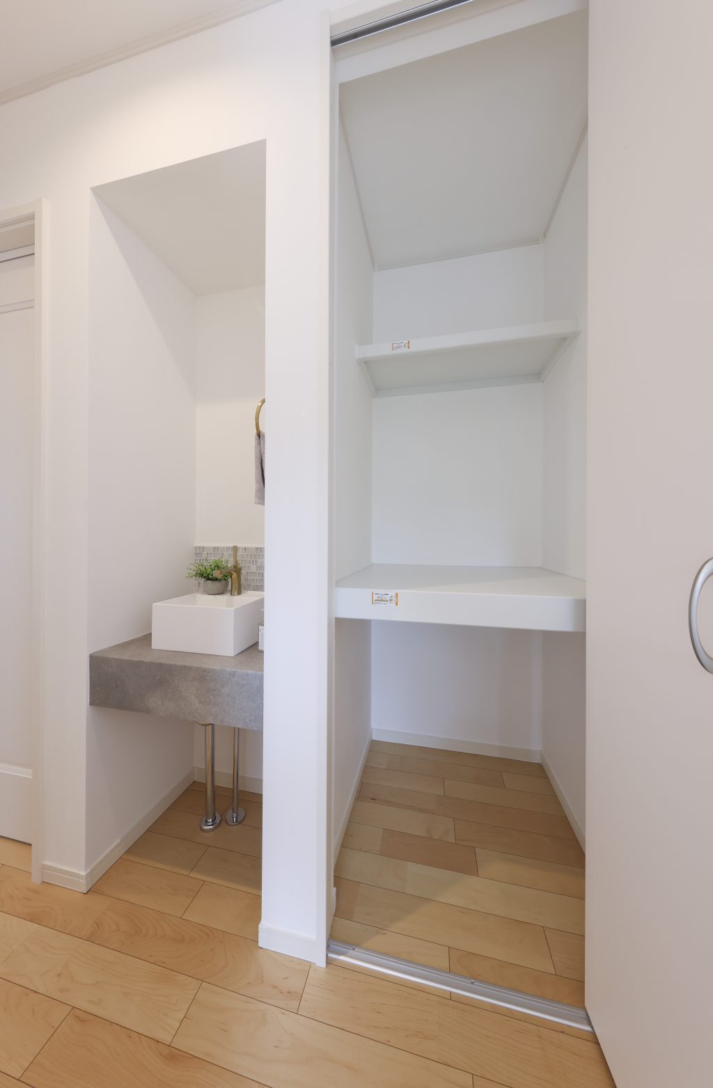 2階へ上がると、サブ洗面台と奥行きのある収納も備えられています。