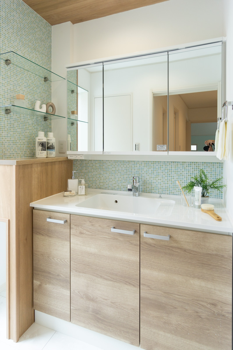 水回りはグリーンのタイルがアクセントになったナチュラルな色合い。