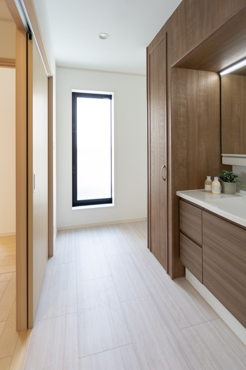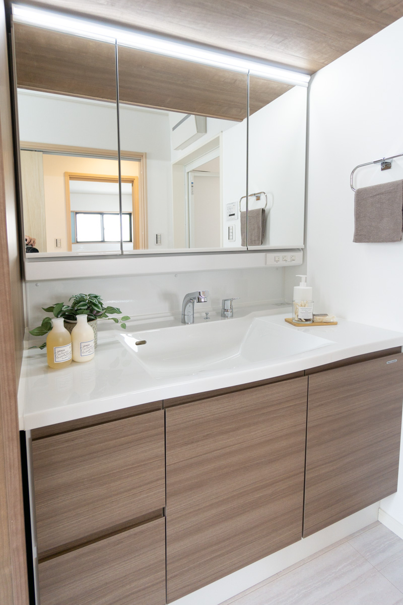 洗面スペースは幅広でゆとりがあり、落ち着いたウッドテイスト。