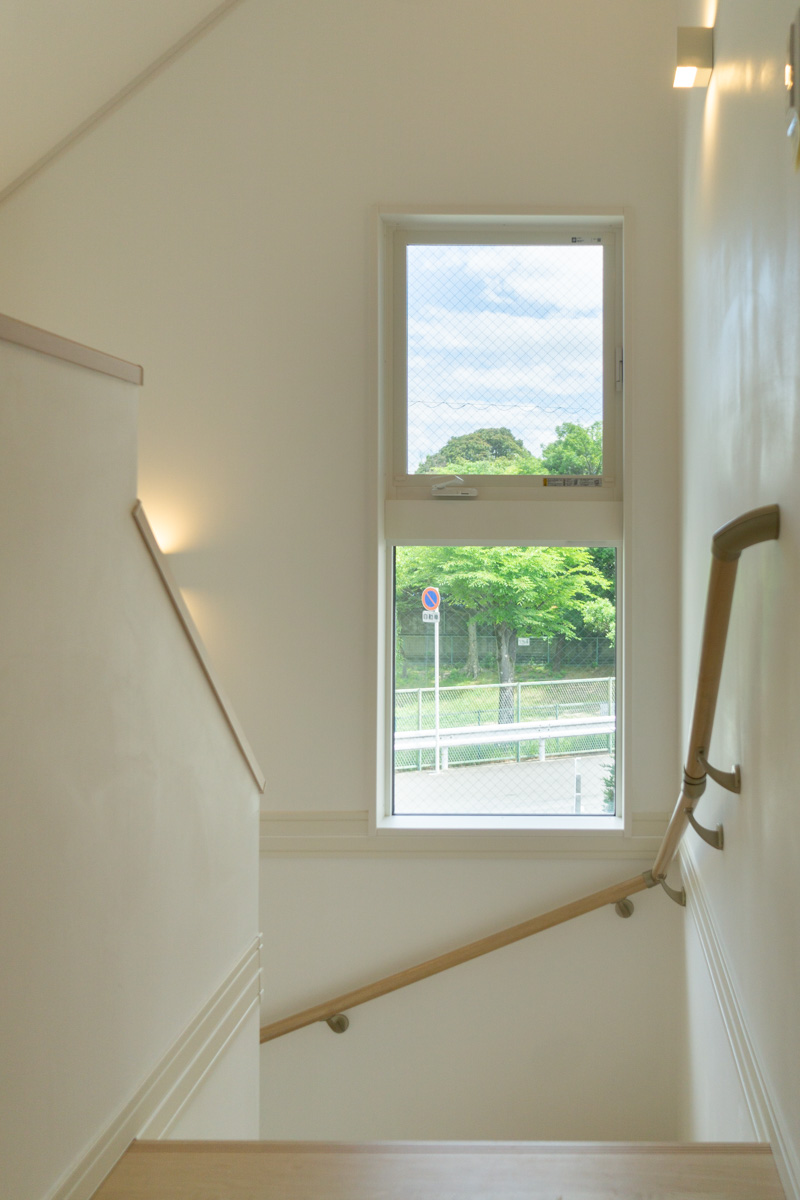 階段にある窓からは、薬師谷公園の新緑を臨むことができます。