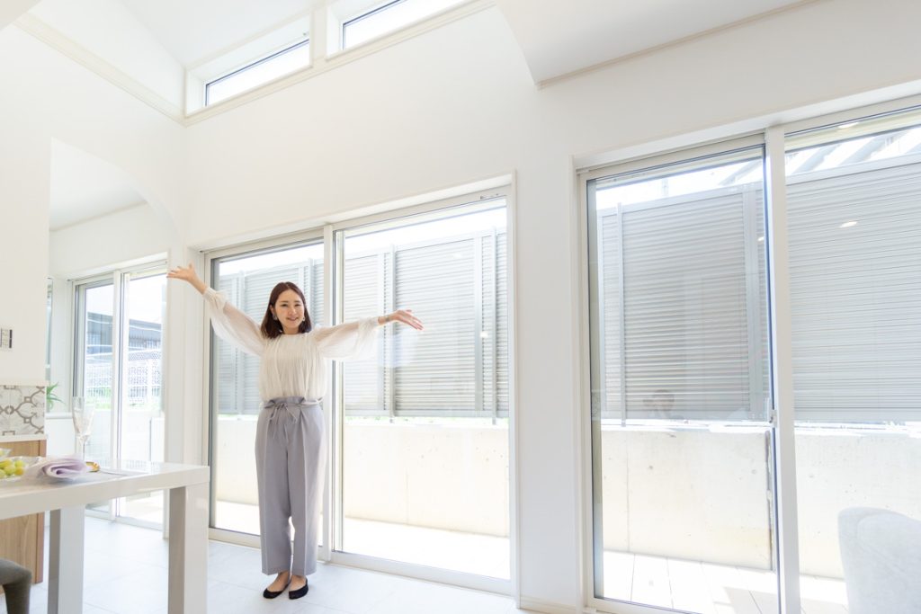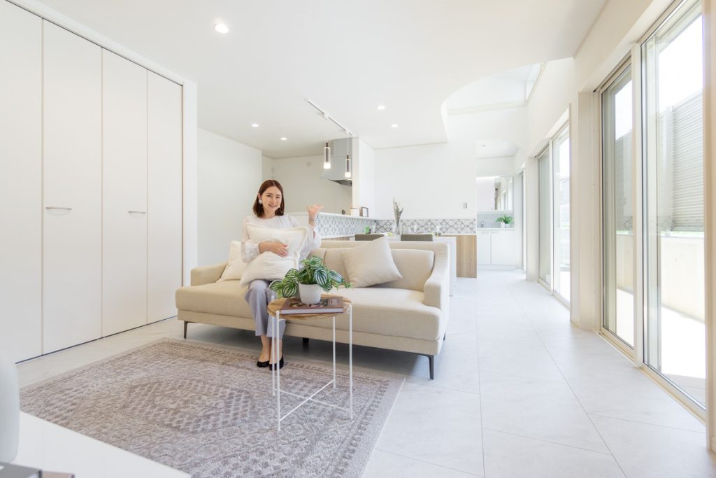 窓からたっぷり光が入る真っ白なリビングがあるお家