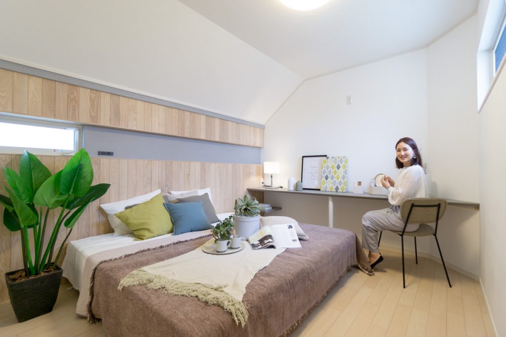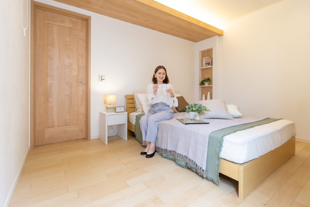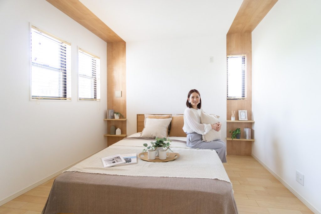 カラーしっくいと木張りのベッドボードが落ち着いた良い雰囲気です。