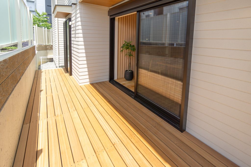 LDKが全部この長いウッドデッキに面してるから、もはやLDKの一部みたいな感じやな。