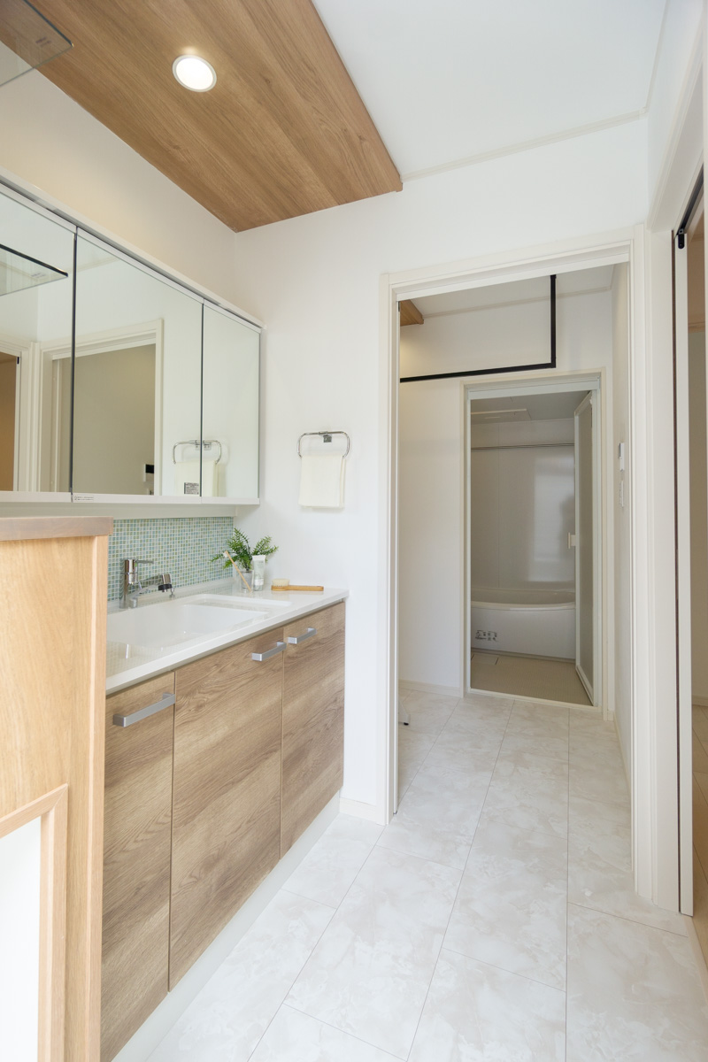LDKの奥には水回りがまとまっており、洗濯機をを回した後、そのままウッドデッキへ出て洗濯物を干すことも可能。