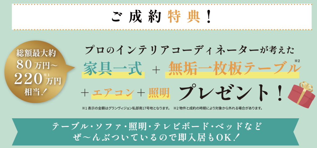 総額最大約80万円〜220万円相当の家具一式+無垢一枚板テーブル+照明+エアコンをプレゼント!!