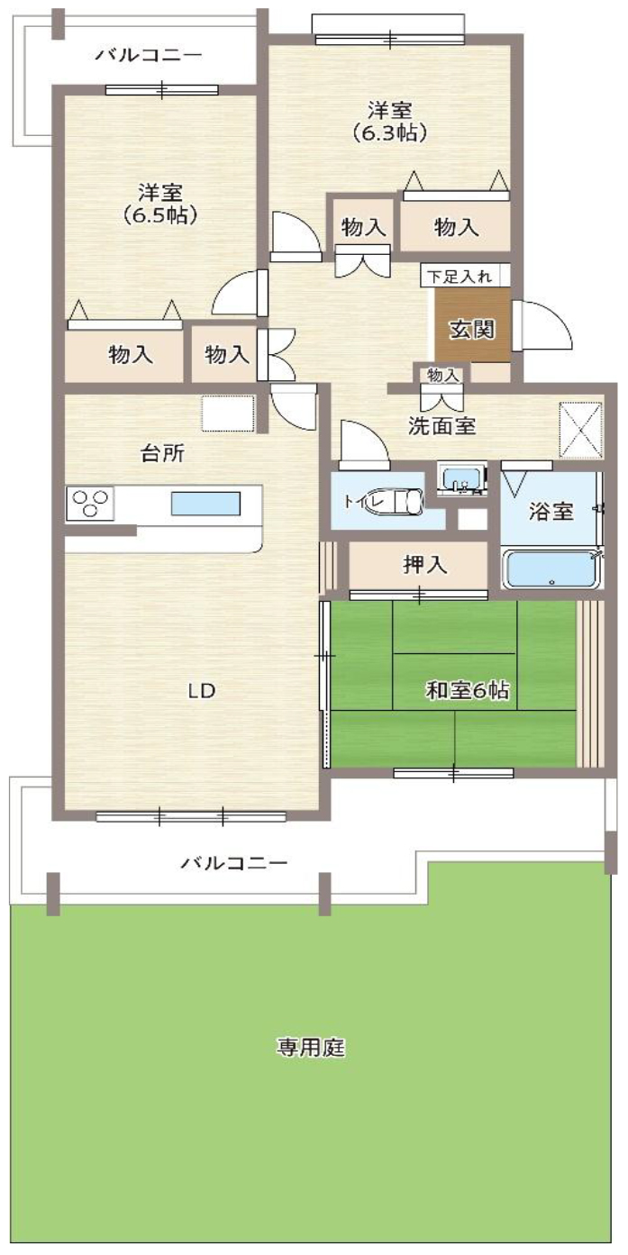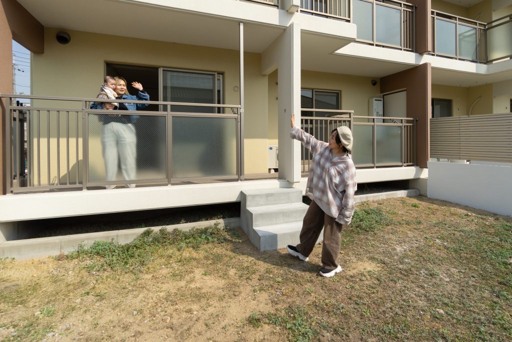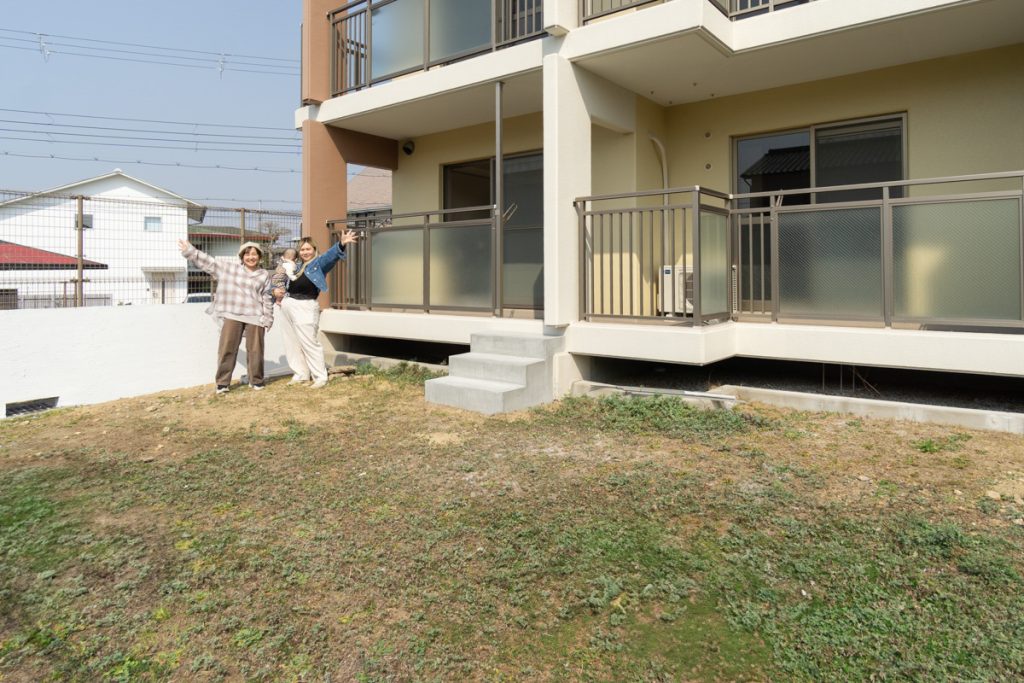 部屋も広いし、庭付きやし、めっちゃ暮らしやすいマンションやな!