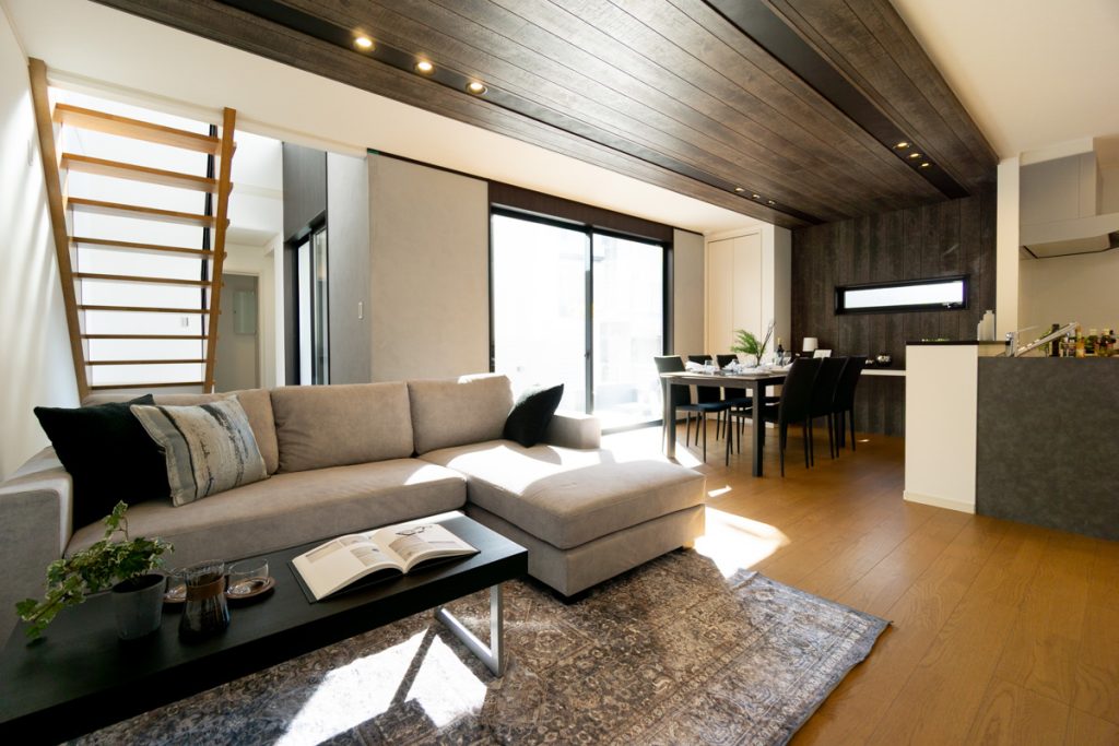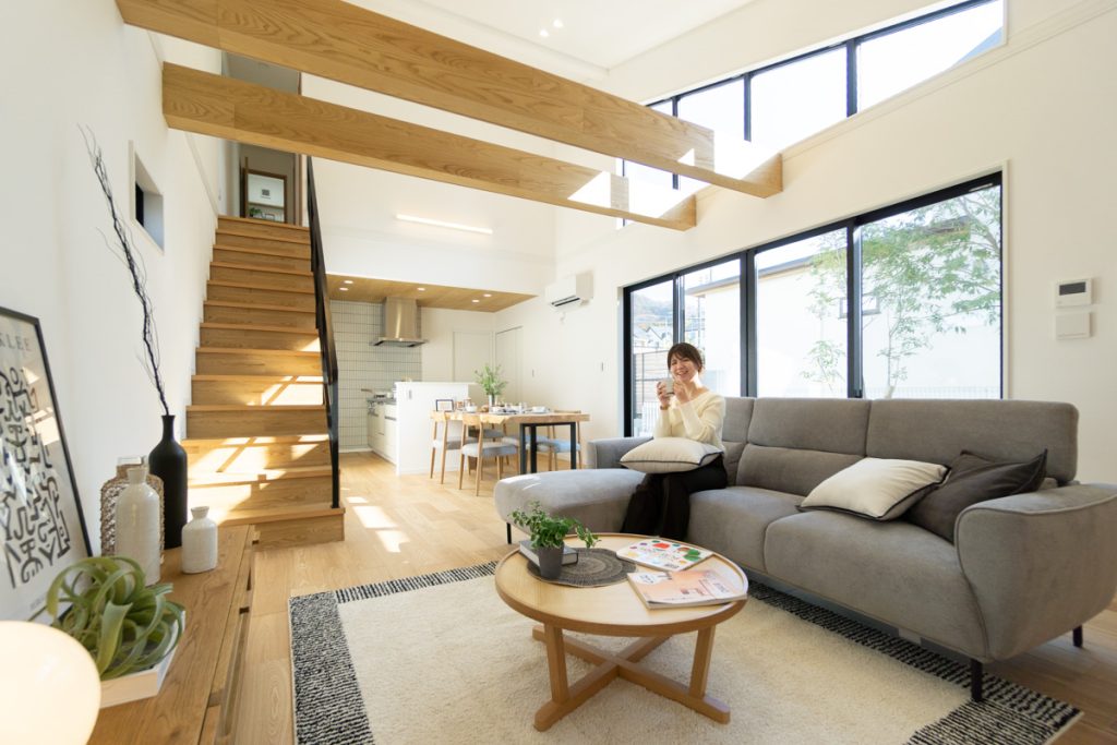 そしてこちらは高い天井に見せ梁が映えるドーンと開放的なリビング!