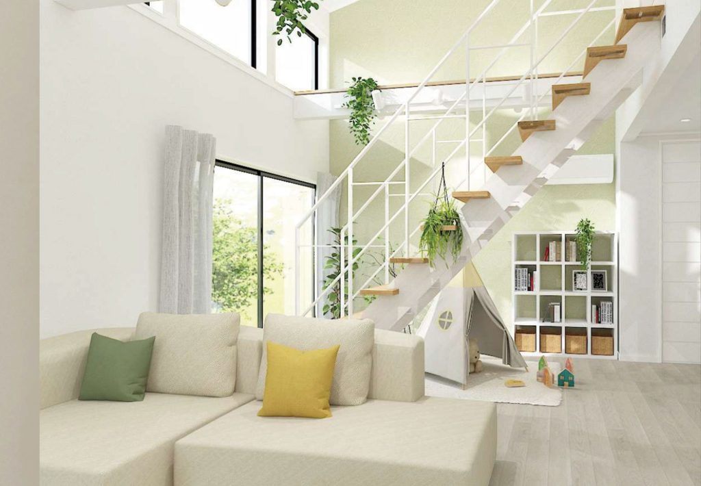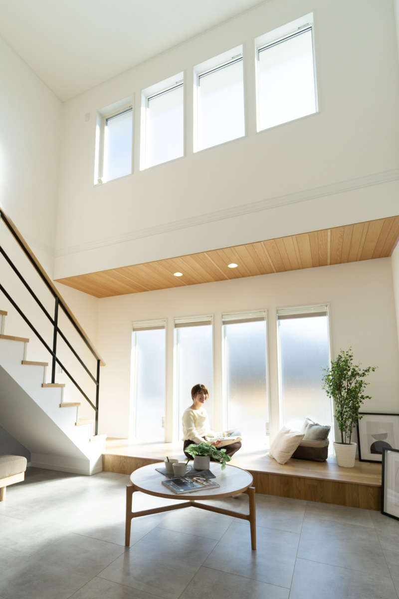 大きな吹き抜け空間から明るい光がたっぷり入るリビング!