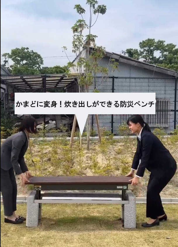 災害時に炊き出しができるかまどベンチ!防災倉庫もあるんですよ!