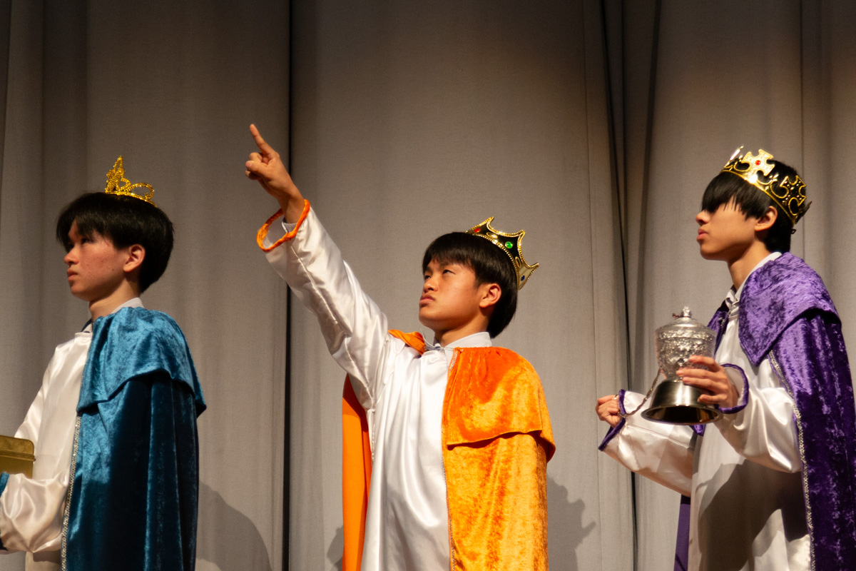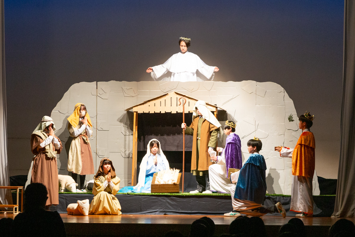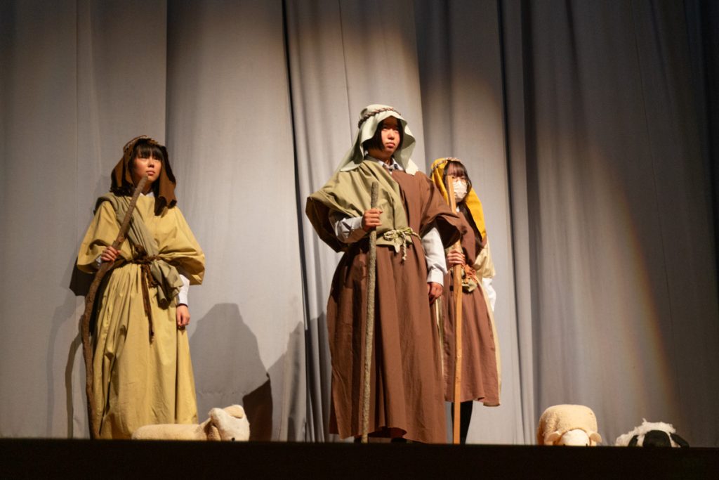 舞台上では、生徒たちがその場で静止し、マリアやヨセフ、羊飼い、天使などの役になりきり、場面を作り出します。