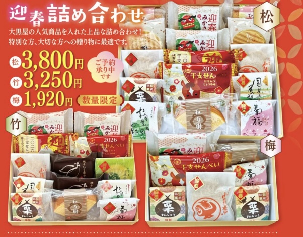 大黒屋では、お年賀、帰省のお土産に最適な【お菓子の詰め合わせ】を種類豊富にご用意しております。