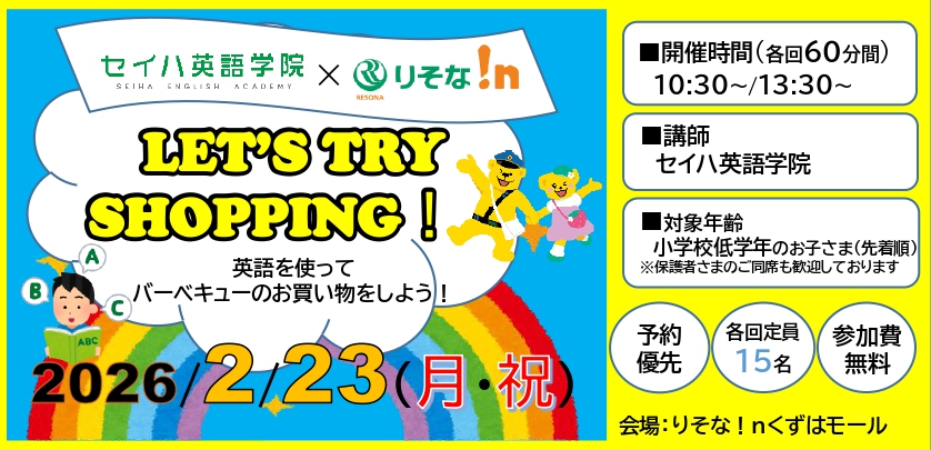 2月は0才から英語が学べるセイハ英語学院とコラボして、小学校低学年のお子さまを対象に、買い物ゲームを通じて本格的な英語やお金の使い方について楽しく学びます。