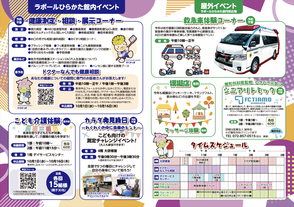 「ドクターなんでも健康相談」や「こども介護体験」は事前申込制(申込期間:10/16まで)なので、興味のある方はお早めにお申し込みください。