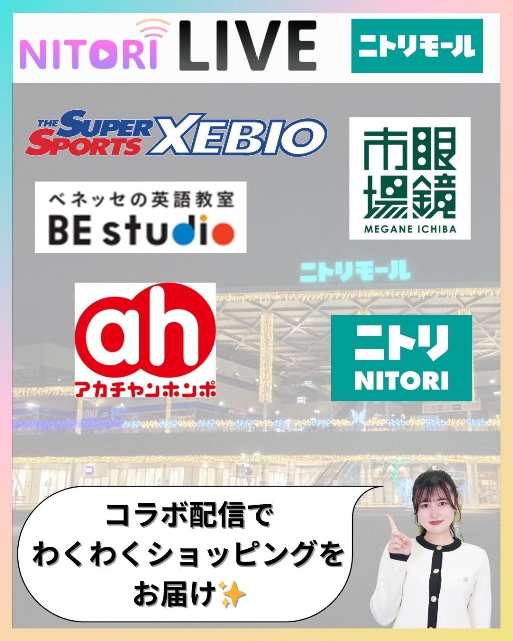 当日は「スーパースポーツゼビオ」、「眼鏡市場」、「ビースタジオ」、「アカチャンホンポ」、「ニトリ」(順不同)が1店舗ずつ、ニトリを中継地点として配信に参加。