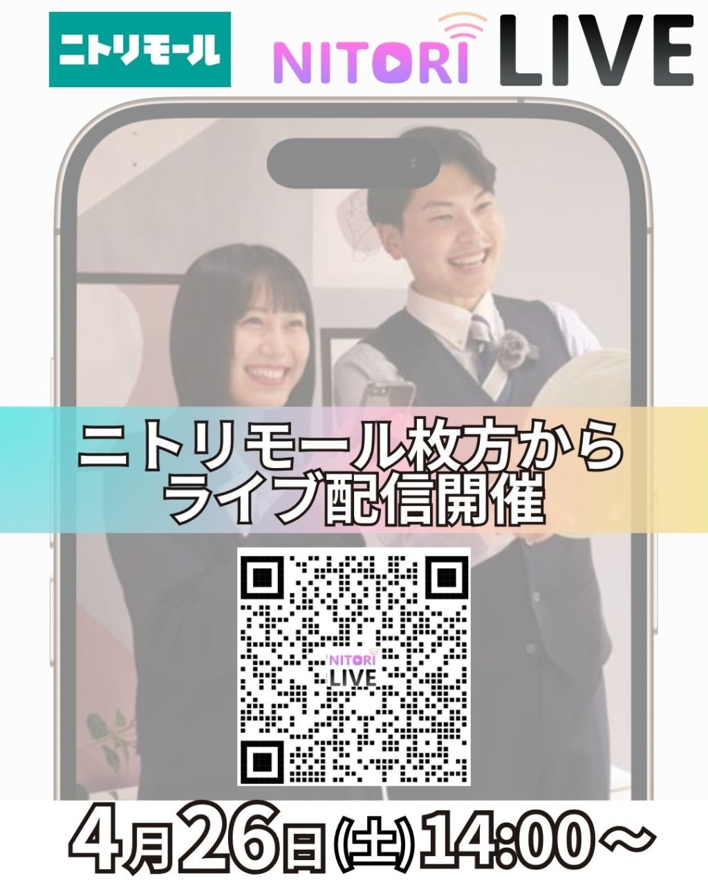 4/26(土)14:00〜(1時間ほど)、ニトリ公式の「NITORI LIVE」と、ニトリモール枚方のインスタアカウント(@nitorimall_hirakata)でのインスタLIVE配信との同時配信を行います。