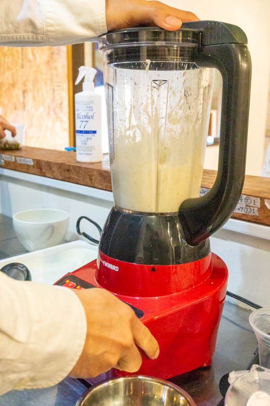 大きめにカットしたバナナと須藤牧場アイスをたっぷり入れて、ミキサーで混ぜ合わせていきます。