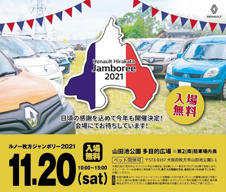 山田池公園の多目的広場にルノーの車がたくさん集まって、