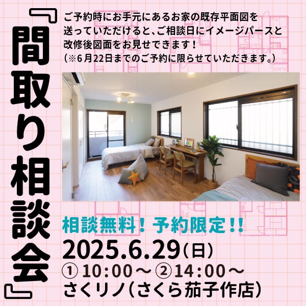 相談会の1週間前(6/22・日)までに、さくらさんへ事前にお家の図面を送ると、相談日にイメージパースと改修後の図面を見せてもらえますよ!