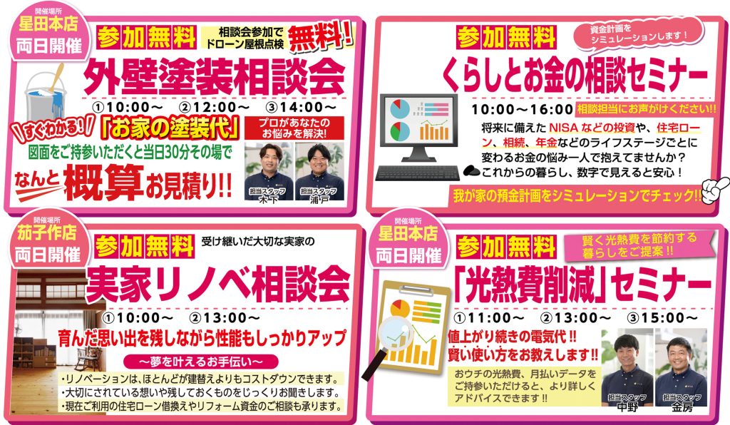 そしてすべて参加費無料の、くらしとお金の相談セミナー、外壁塗装相談会、実家リノベ相談会、「光熱費削減」セミナーも行われますよ!