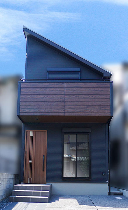 落ち着いた色合いの外壁に、ウッディなベランダと玄関ドアがいいアクセントになっています。