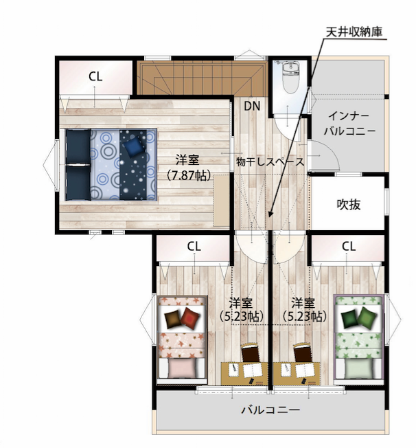 吹抜けを作ることで室内により多く光を取り込めますし、天井が高くなるため部屋を広く開放的にみせる効果があります。