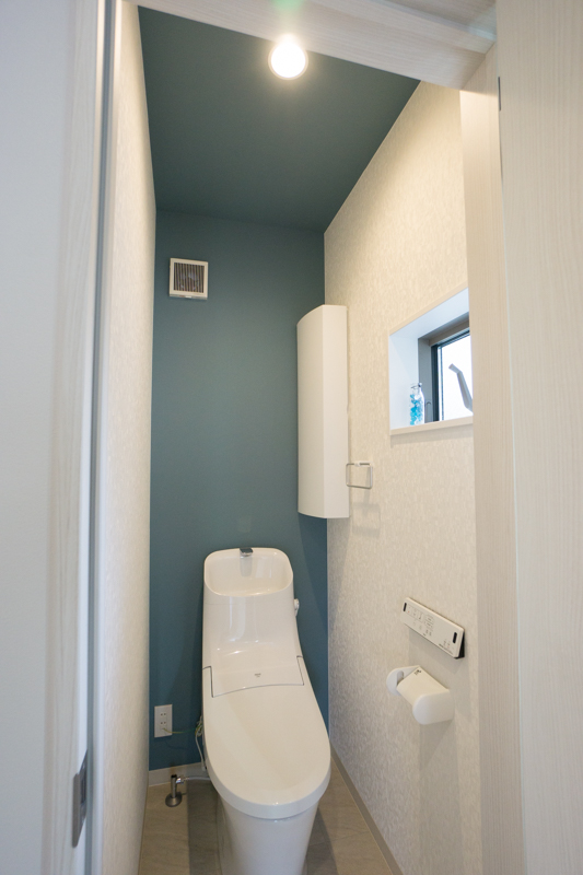 2階のトイレはブルーの壁紙が目を引く仕上がり。