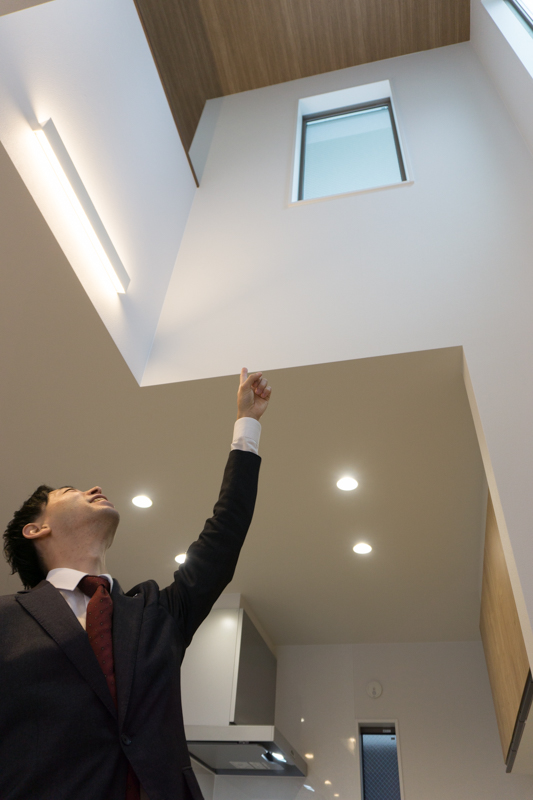 リビングの窓が北側にあるので、南側の採光を取り込むため吹抜けを設けました。