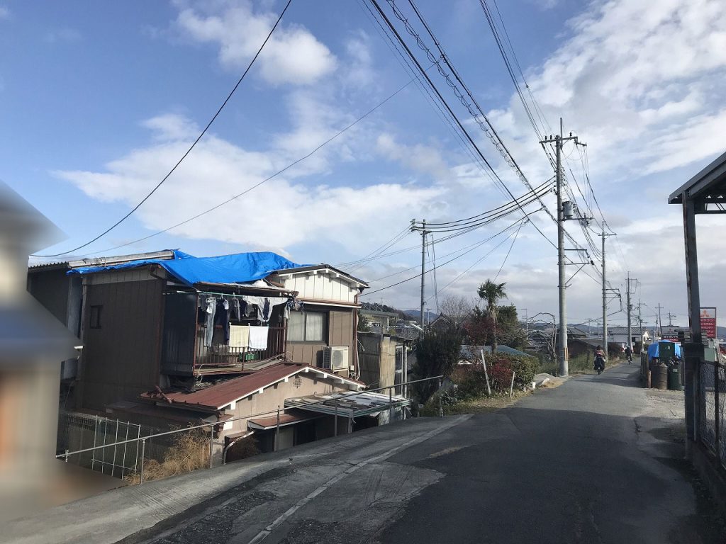 屋根にいっぱいブルーシートがかかっている家を見てもらいましたね(笑)