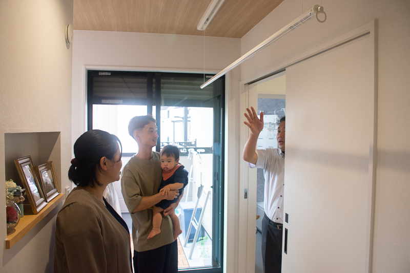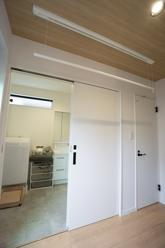 洗面室前の廊下には物干しスペースを設けて、雨の時はここにすぐ干せるようにしています。