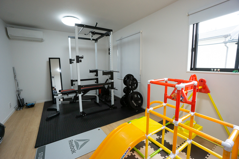 子どもが生まれたらなかなかジムに行けなくなるなと思ってたので、家の中に作っちゃいました(笑)原戸さんに床の耐荷重なんかを聞いたりして…。