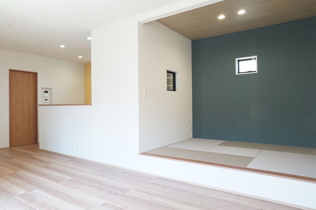 和室の壁紙は少し落ち着いた色味にして、ちょっとした段差をつけたことで腰掛けやすく落ち着いた雰囲気になっているんです。