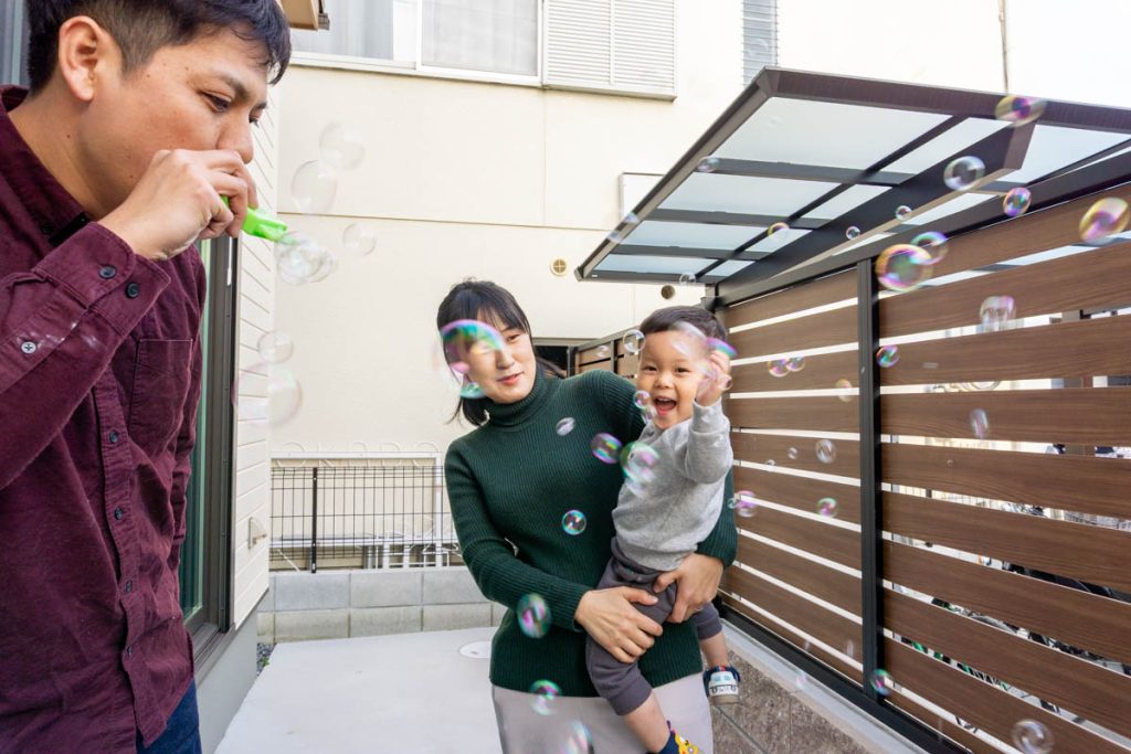 今は子どもがシャボン玉が好きなのでよくテラスで遊ぶんですが、リビングのすぐ外のスペースでこれだけ遊べたら本当に充分だなと思います。