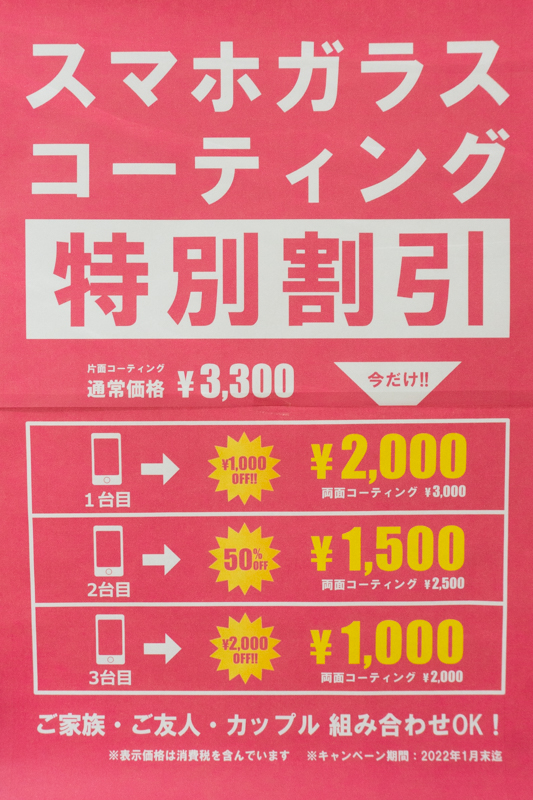 iPhoneを傷や汚れから守る、スマホガラスコーティングが2022年1月末までお得になっています。