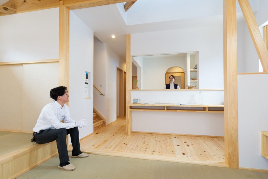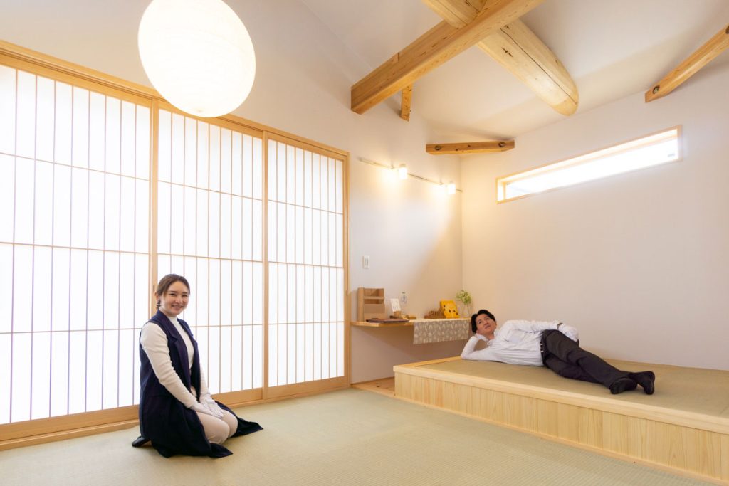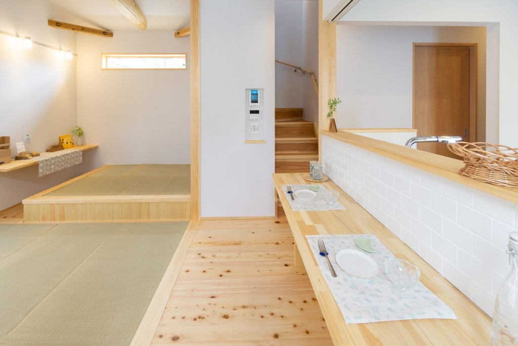 リビング隣はあえて小上がりの畳スペースにしてあるので、ソファなどを置かずともここに腰掛けて過ごせます。