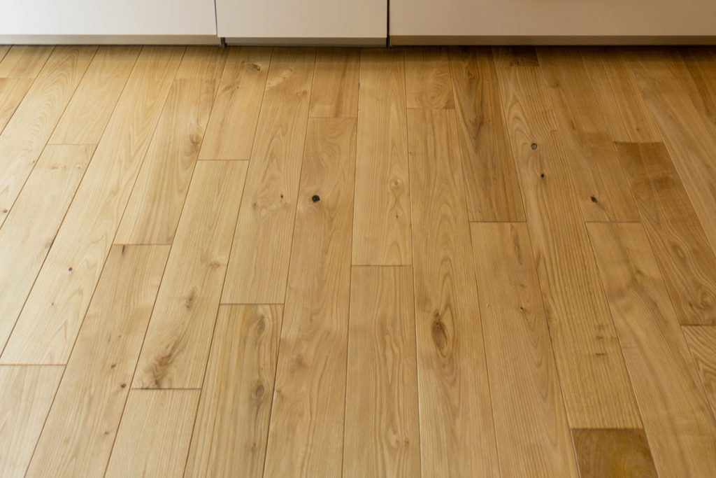 キッチンの床材は水に強く、硬くて傷もつきにくい栗の無垢材を使用。