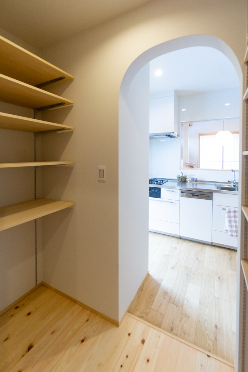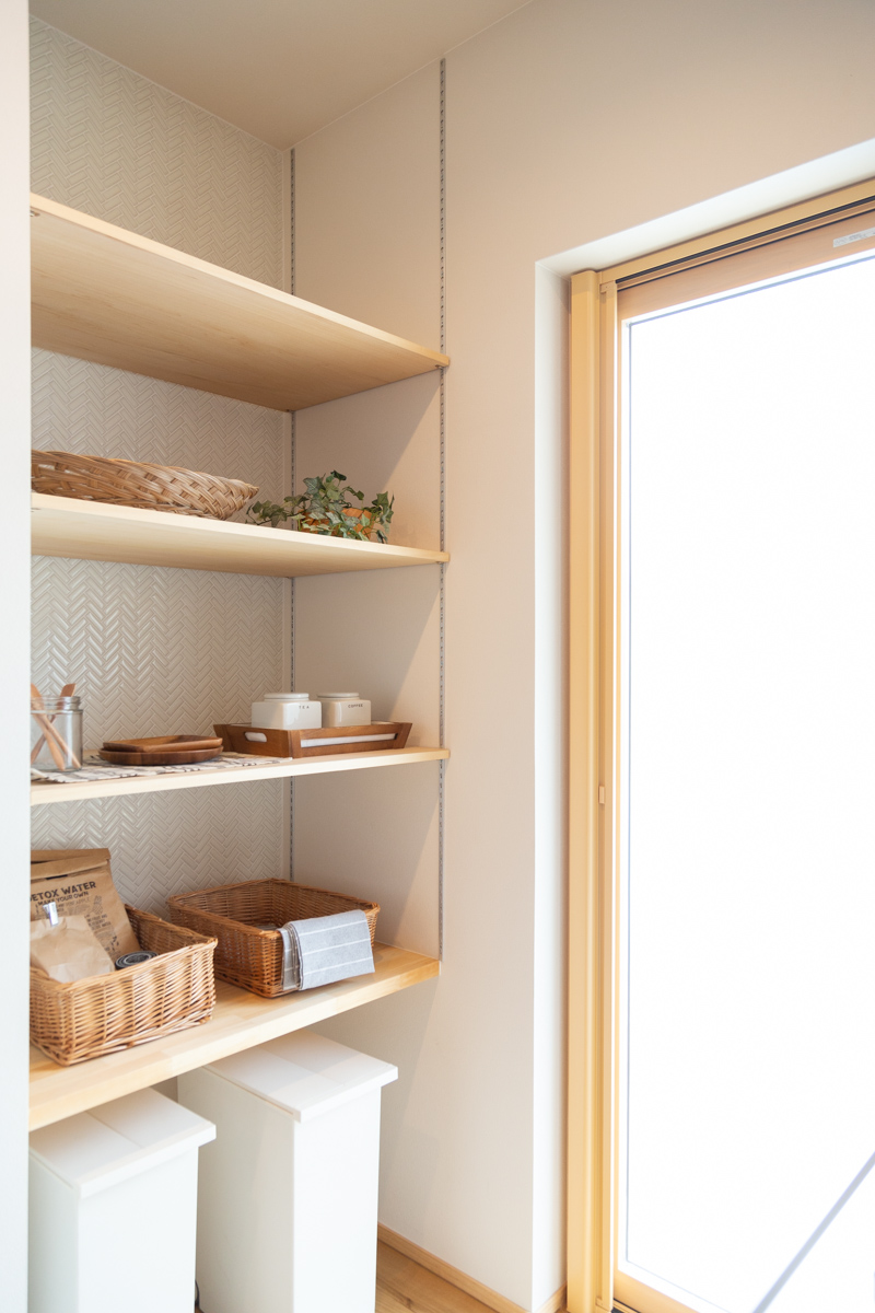 キッチンのうしろにはタイル壁がかわいい収納棚にパントリーも備え付けです。