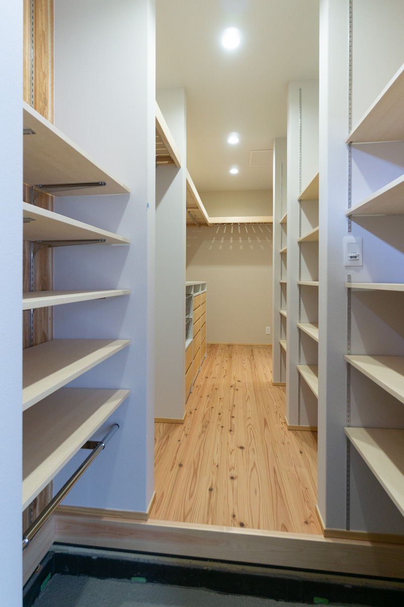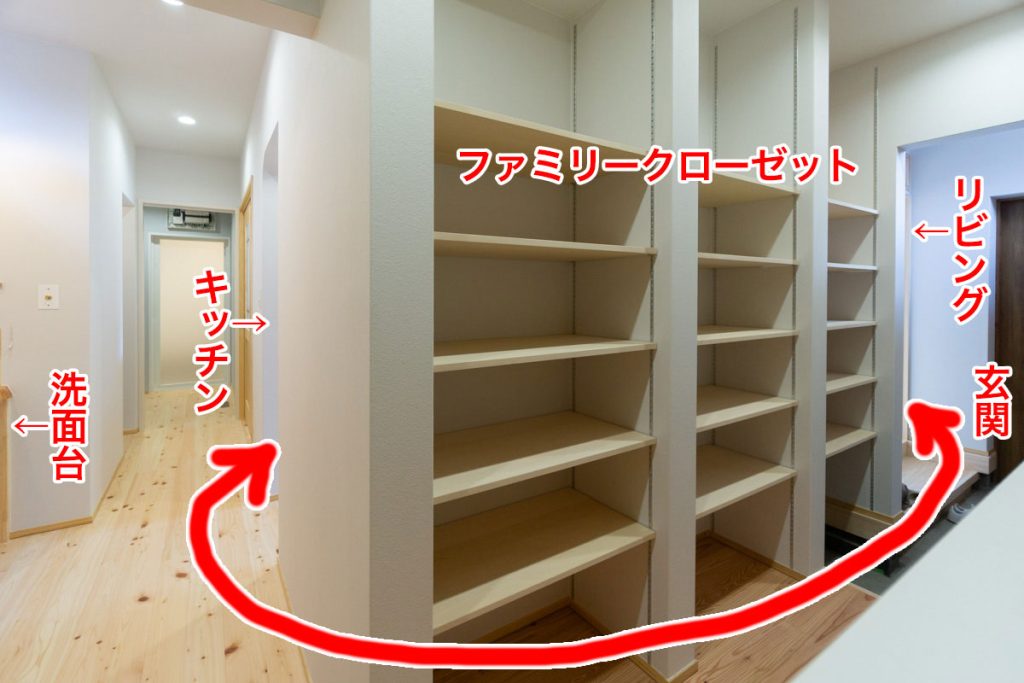 キッチン→洗面→クローゼット→玄関と、家中をぐるぐる回れる回遊動線になっています。