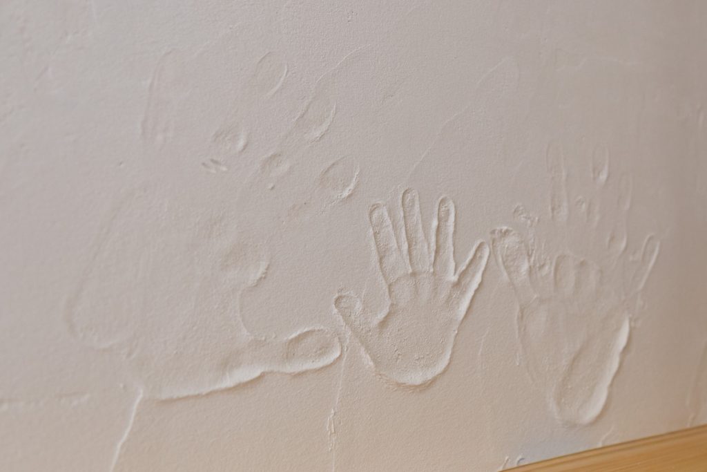 2階トイレの壁は施主様が自ら塗ったそうで、ご家族の手形が押されていました。