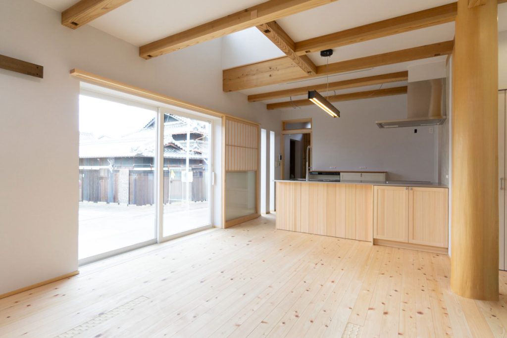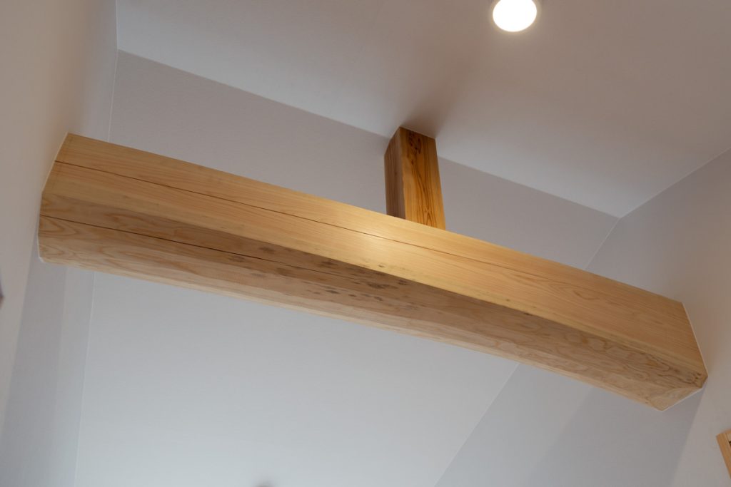それに天井は勾配天井で開放感を出して、大きな太鼓梁をドンと見せるデザインにしました。