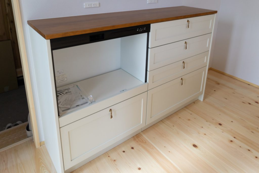 背面のアンティーク調カップボードもWOODONE。細部までオシャレです。